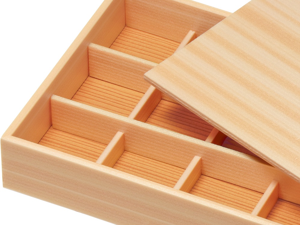 細かな仕切をいかして、手まり寿司やひとくちサイズの惣菜を盛りつけた可愛らしいお弁当にもお使いいただけます。