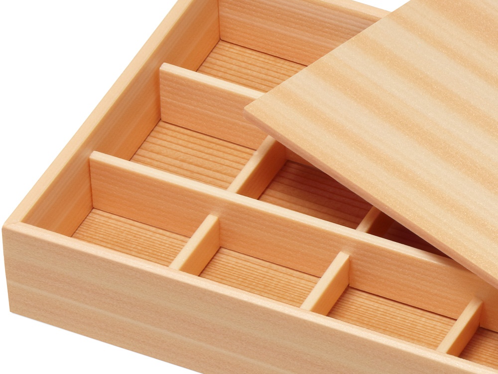 細かな仕切をいかして、手まり寿司やひとくちサイズの惣菜を盛りつけた可愛らしいお弁当にもお使いいただけます。