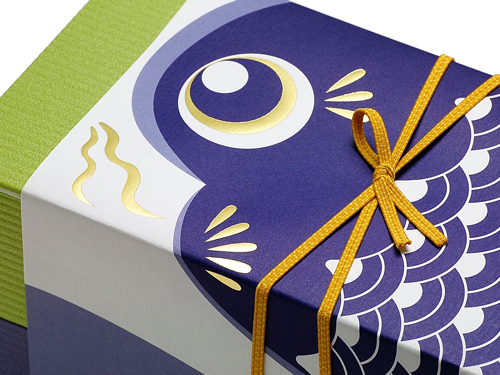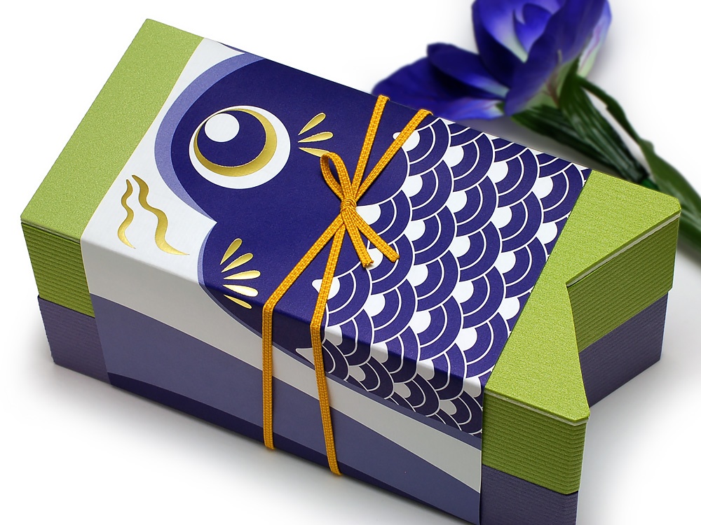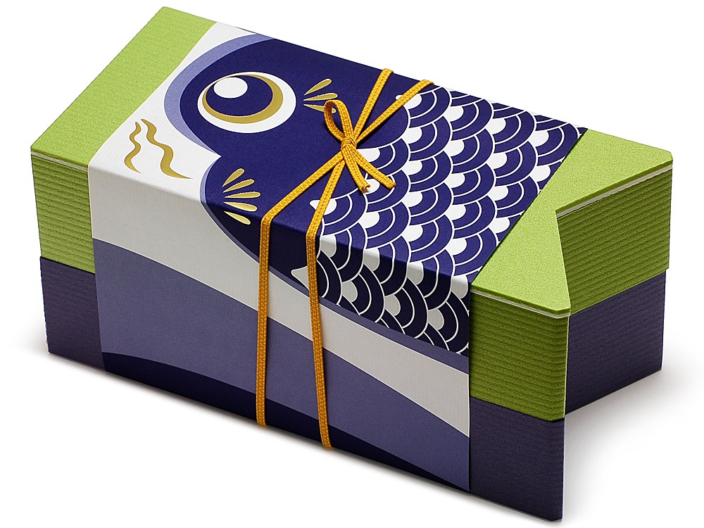 珍しいカタチの折箱に、ユーモラスなこいのぼり柄の掛紙と、ゴムをセットにした、こどもの日のための特別な折箱セットです。