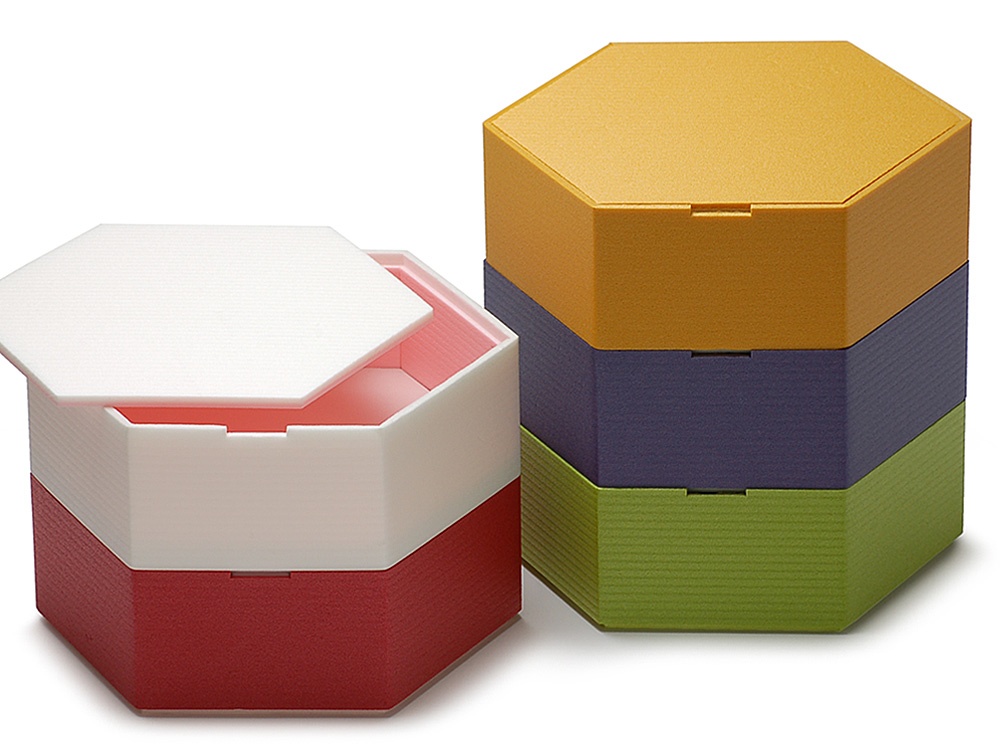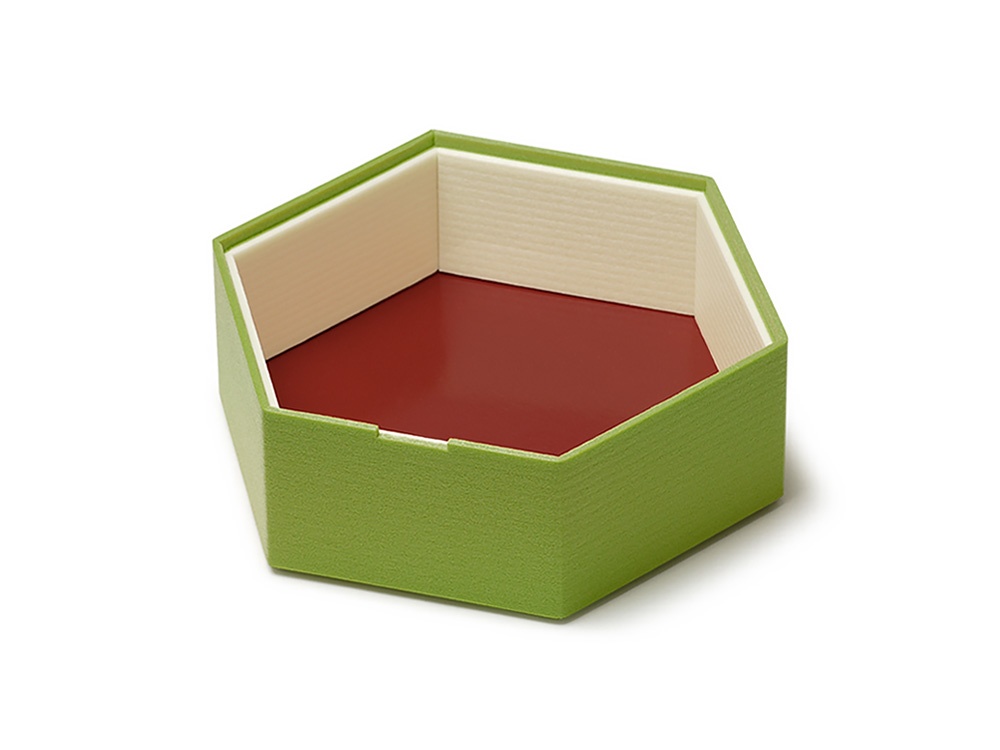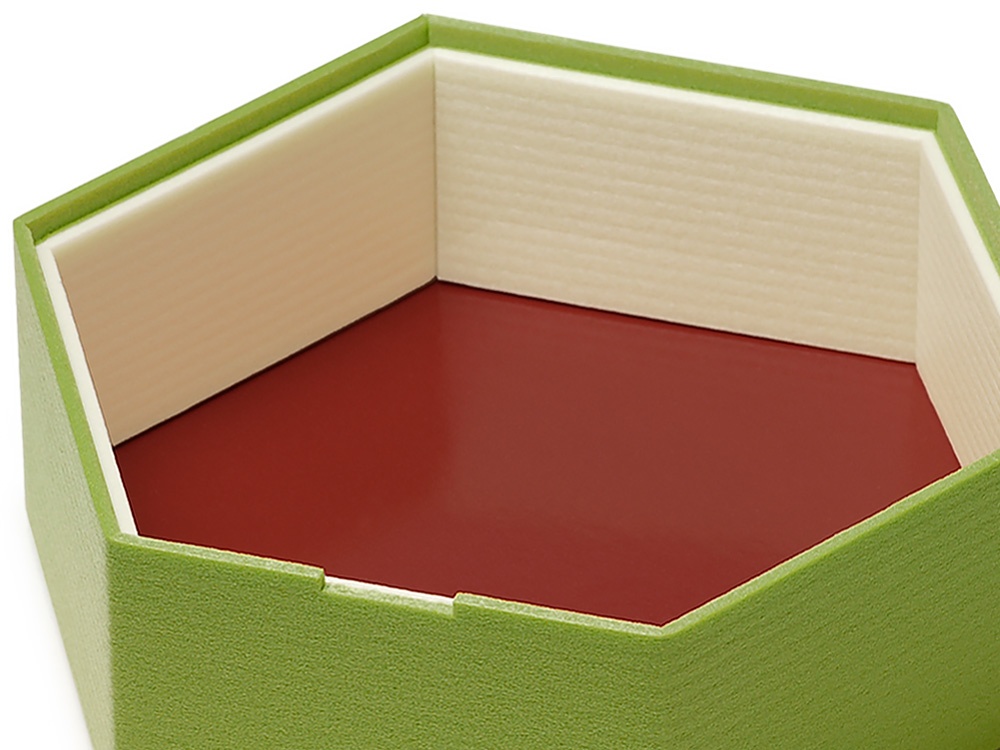 色かさねシリーズ、段重ね対応の六角型折箱です。