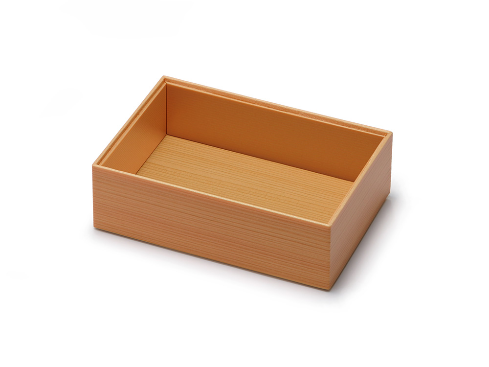 美しい柾目を表現したユニ折箱KU杉香。上質な雰囲気のあるKU発泡プレートに、勝藤屋オリジナルの新色をのせて作りました。