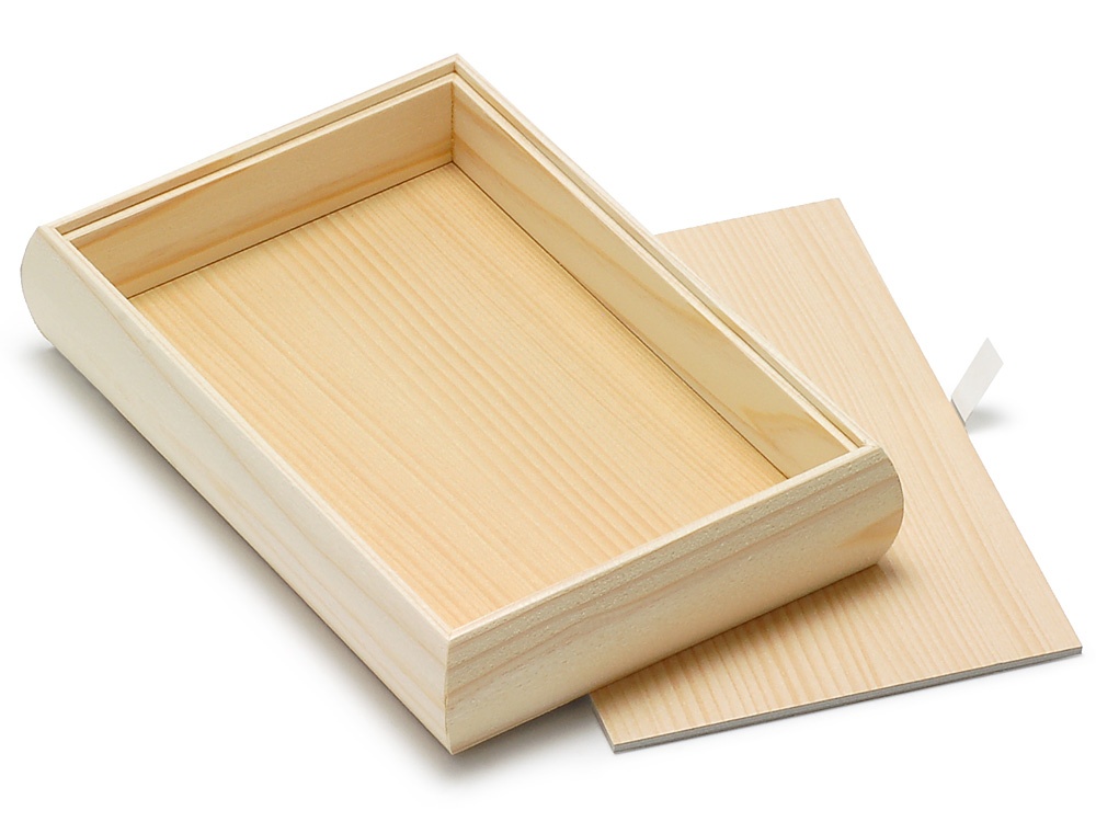 厚さ9mmの本体側板を削り、丸みを持たせました。優しさと上品さを感じさせるデザインが特徴の木箱です。ちりめん山椒などの佃煮や、干菓子などの詰め合わせにおすすめです。