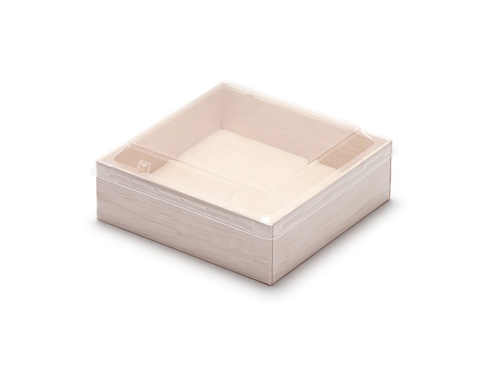 側面はグラシン両面ラミネート、底面はフィルム両面ラミネート加工が施されているので、米粒などが付きにくく食品の直載せが可能。水分にも強く、木粉・ささくれの発生を抑えます。