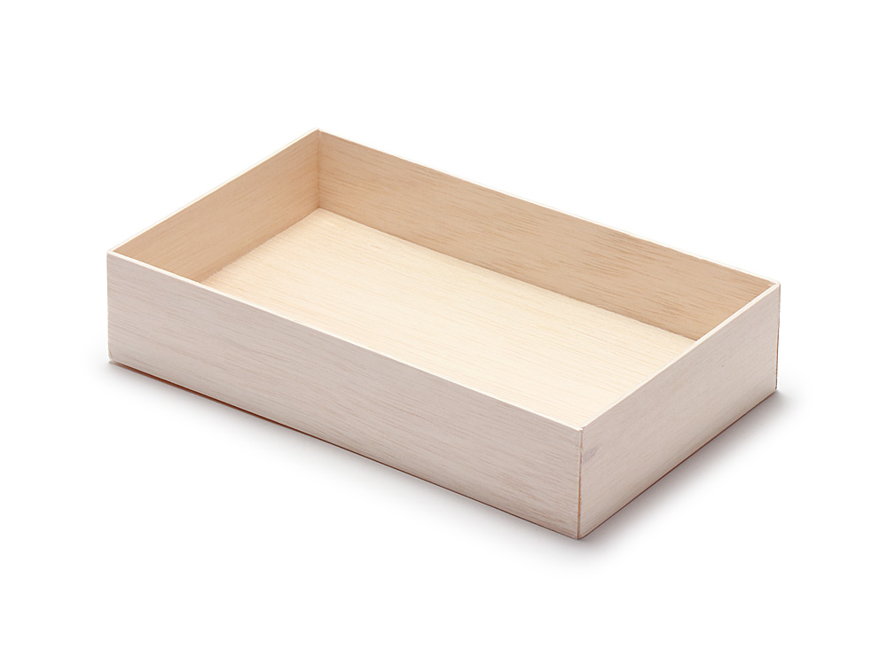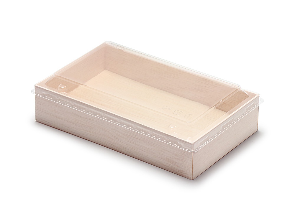 環境への配慮から、成長の早い「ファルカタシンゴン材」を使用してつくられた木製容器です。滑らかな質感と、清潔感ある佇まいは、どんなお料理にも似合います。