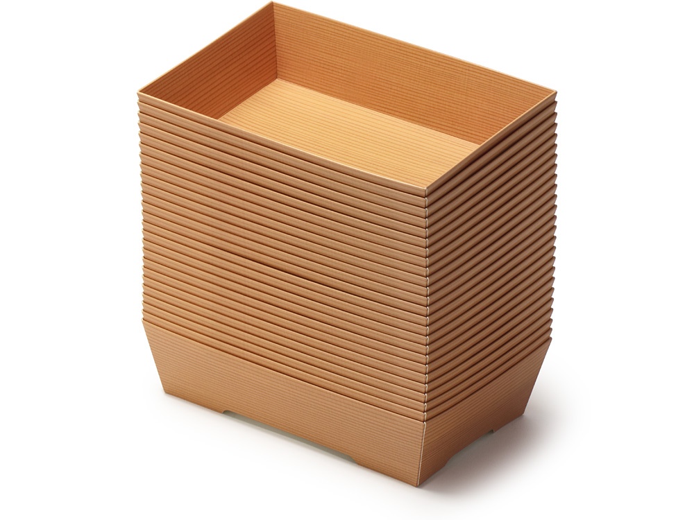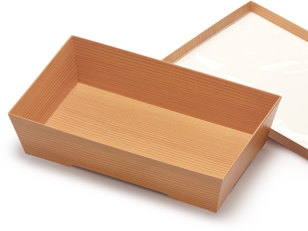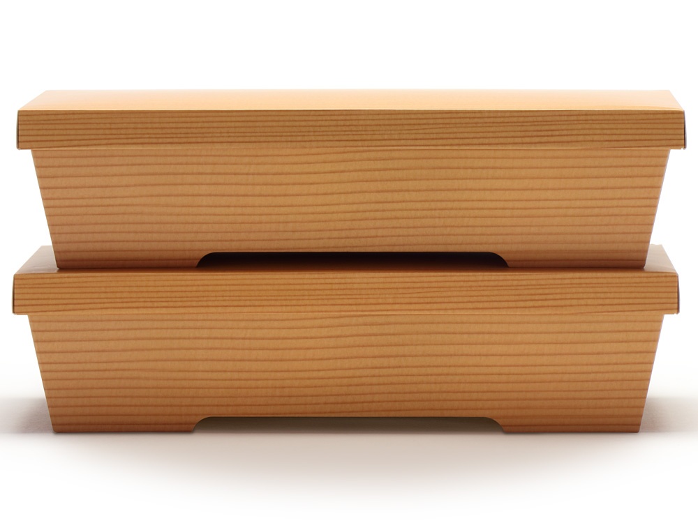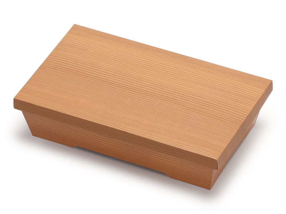 電子レンジ対応、端正な杉の柾目を写した紙器