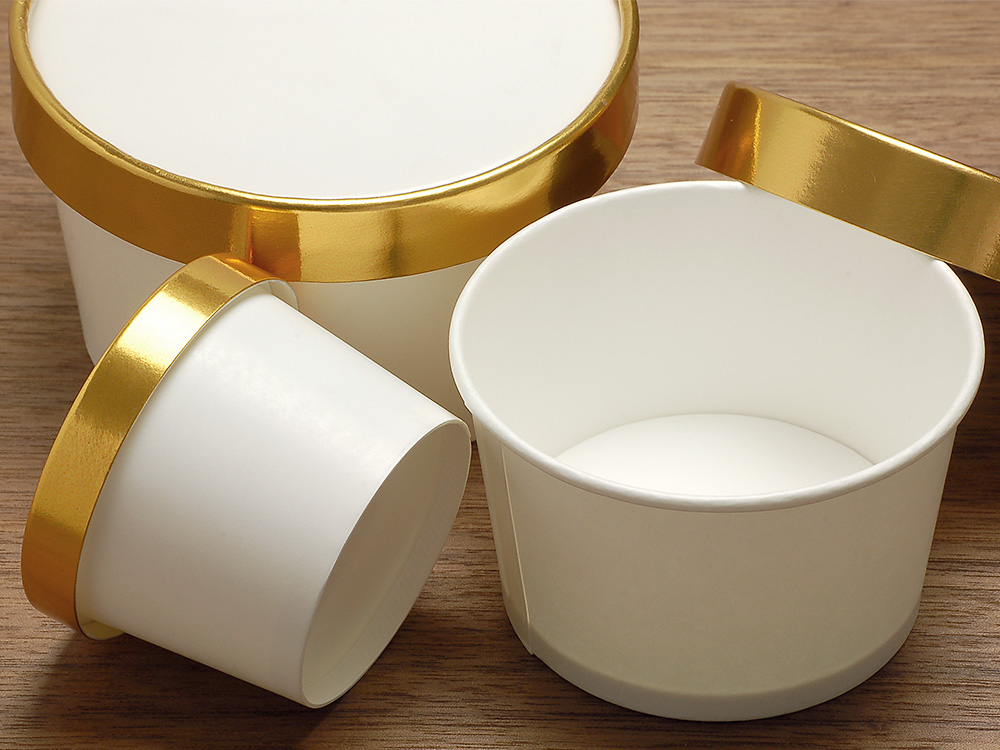 トップシール加工がしやすいよう、本体のフチ部分は平たい形状になっています。本体とは別に、お持ち帰り用の金リングの紙製蓋も別売りでご用意しました。
