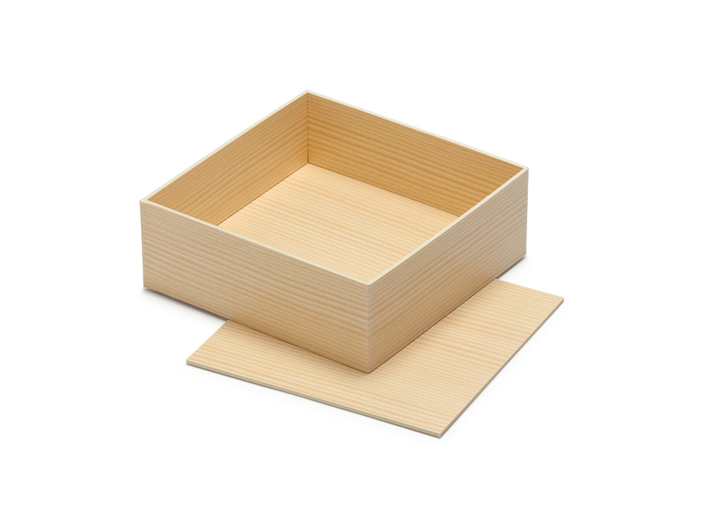 原紙にフレッシュパルプ(針葉樹・広葉樹を原料とし再生紙を含まないパルプ)を使用した紙の折箱です。断面のクリーム色は、染色等を施していない素材本来の自然な色。