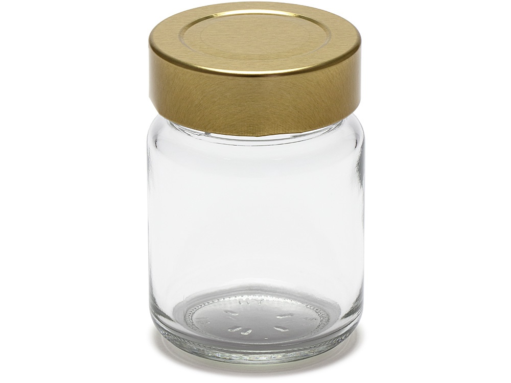 ワンタッチで開けられるツイストキャップ(金)がセットになったガラス瓶です。