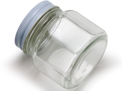 密閉性の高いスクリューキャップ(白)がセットになったガラス瓶です。本体は八角形の形状になっています。