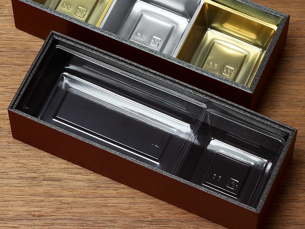 あらかじめトレーに料理を盛り付けたあと、持ち上げて折箱に入れることができるよう、薄手ながらある程度の重みに耐える強度も持たせました。
