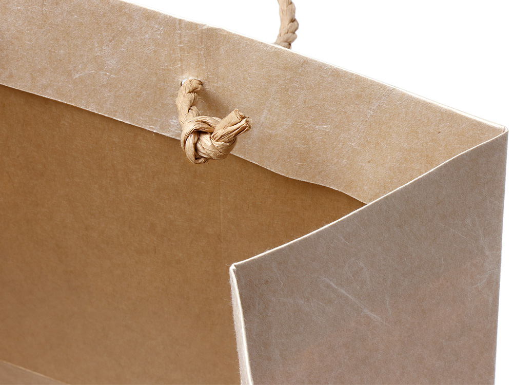 絹流(きんりゅう)シリーズの手提袋は、クラフト紙の表面に雲竜繊維をラミネートし、和紙のような質感を実現しています。それに似合うよう、ハンドルも自然な風合いの紙紐を使用しています。