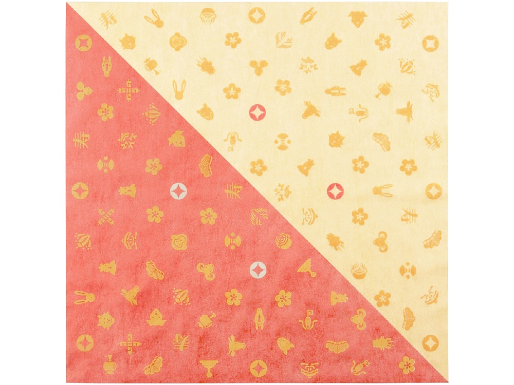 大胆な配色に十二支のイラストを散らしたデザインは、結んだ時の柄の出方も楽しめます。