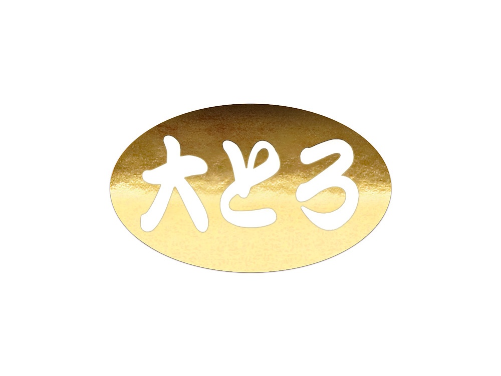 商品アピールの為の鮮魚シール「大とろ」。光沢のあるゴールドのデザインで、高級感があります。