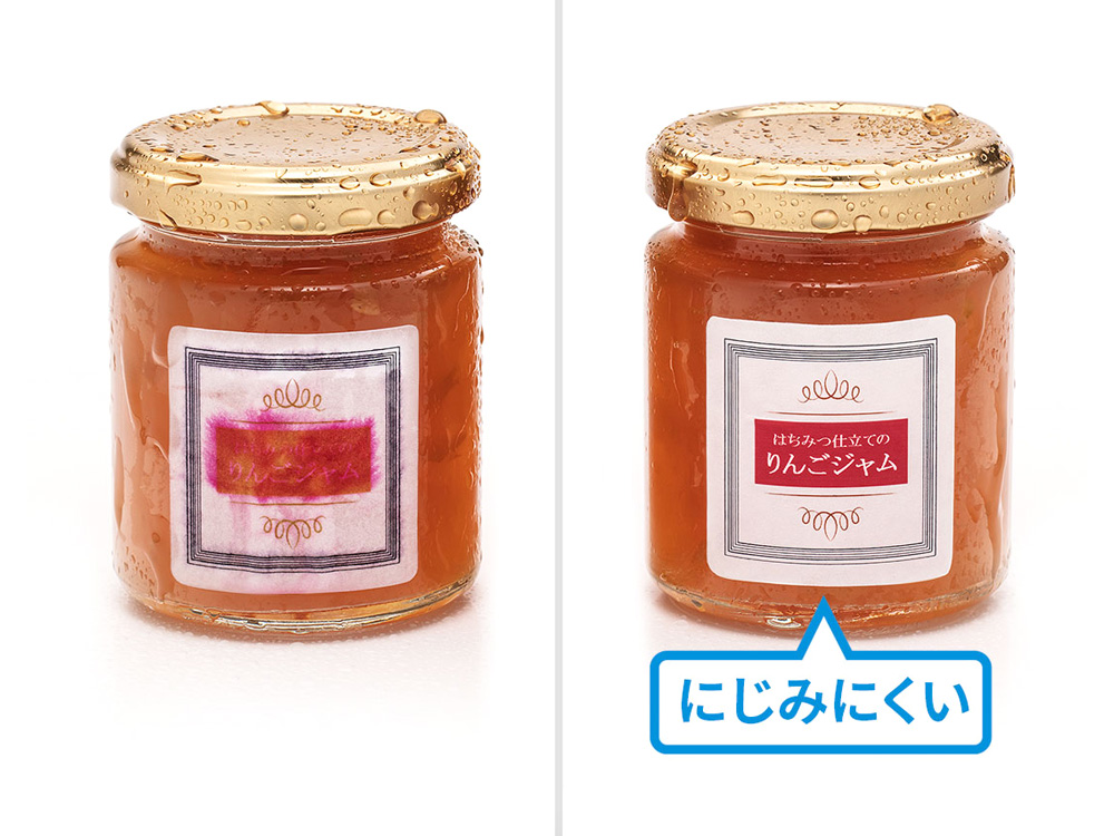 耐水性のあるラベルシールです。マット調の落ち着いた質感で、結露してもインクがにじまず、ラベルが剥がれたりしません。