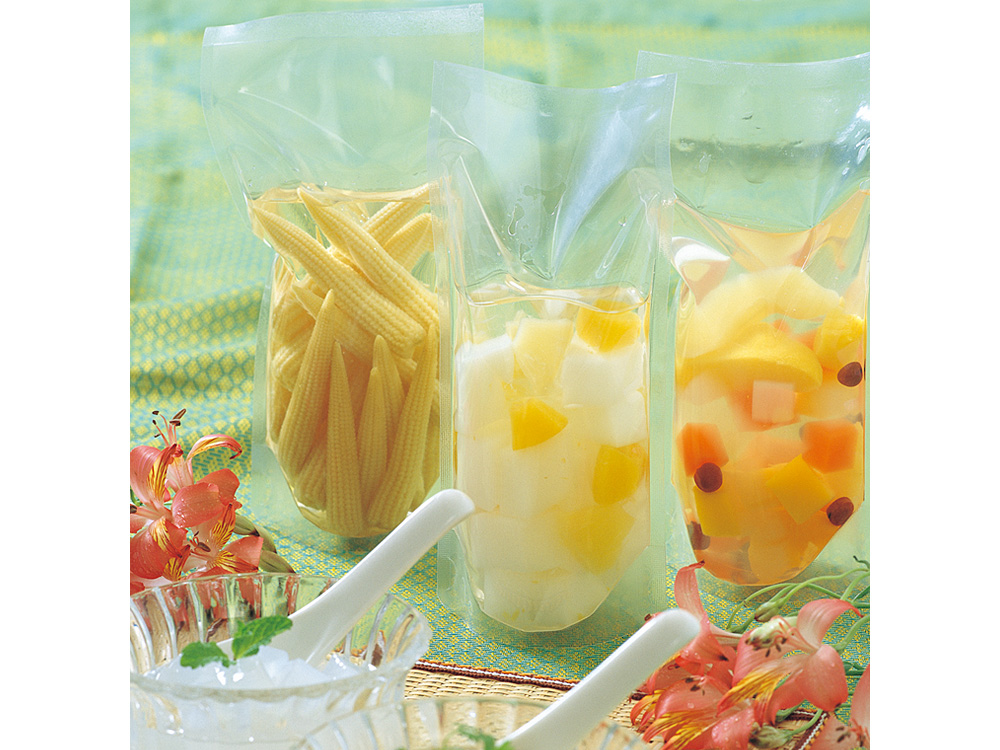 ディスプレイ効果も期待できる、自立安定性の高いスタンドタイプの袋です。固体の食品はもちろん、液体、粒体、ペースト状の食品におすすめです。強度に優れたナイロン製。底部分の角2箇所はRカット加工を施しています。ビン・缶容器の代わりとして、詰め替え容器として、省資源・省スペースでお使いいただけます。
