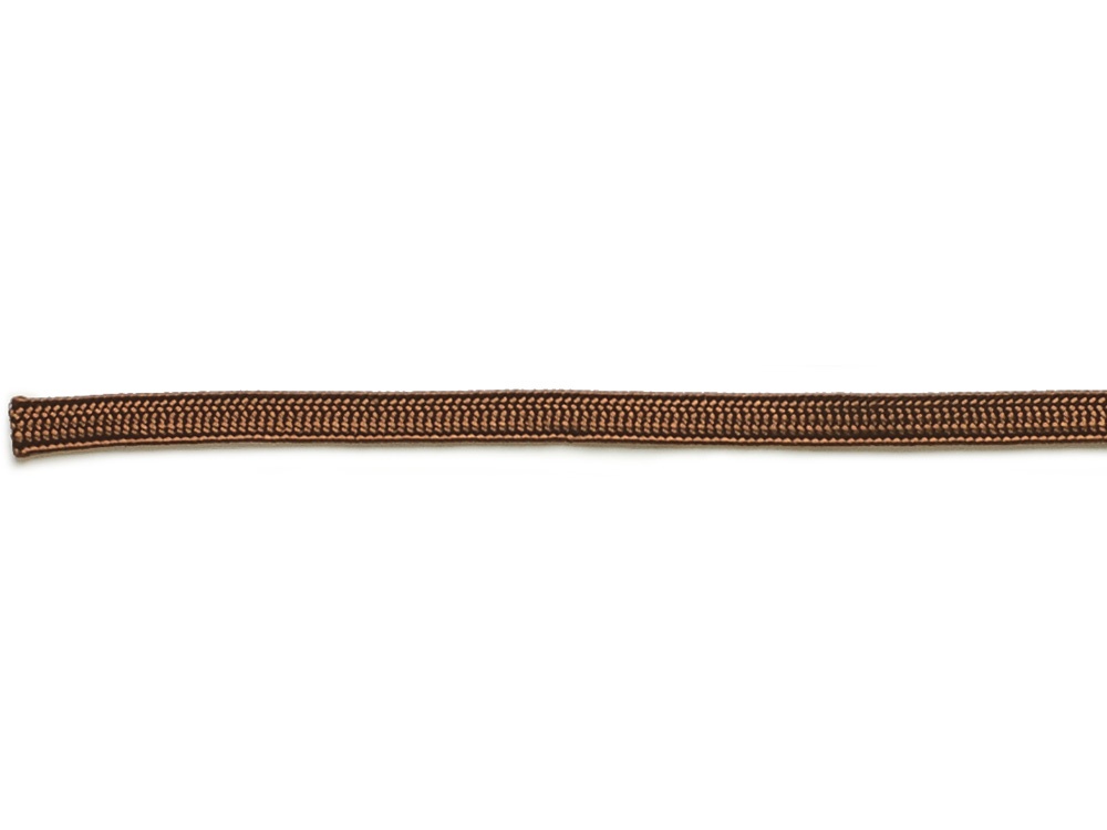 綾竹組みの平紐タイプのくみひもです。しっかりとした織り目が生み出す光沢が上品です。どんな色にも馴染みやすい、優しい印象の茶色です。