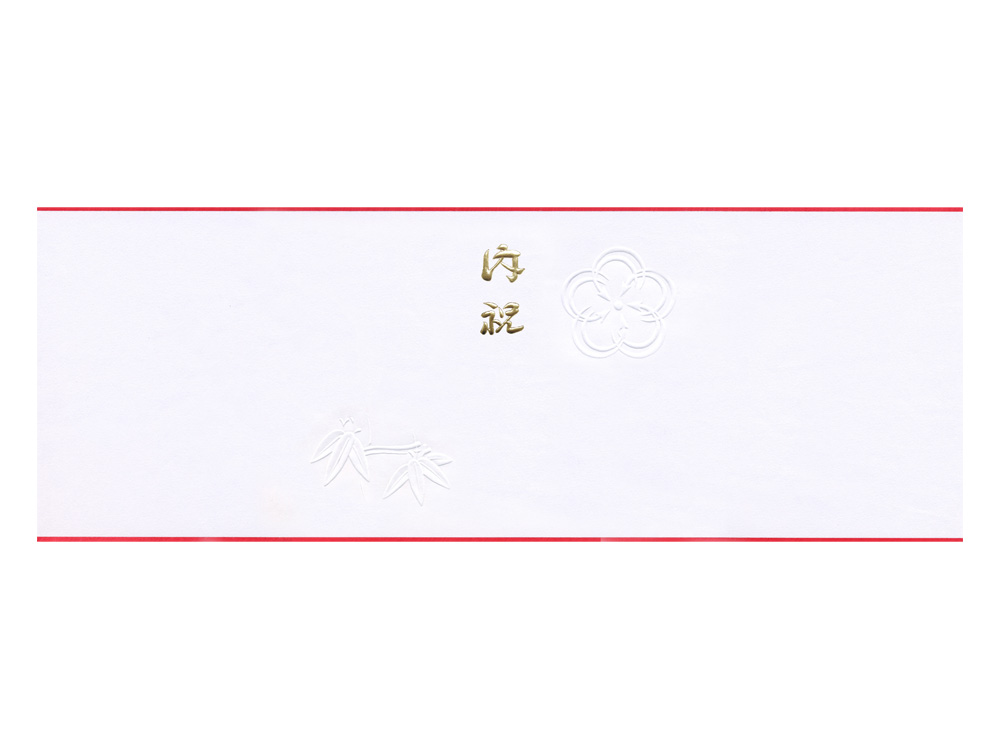 天地を赤く刷毛染めし、梅と竹笹の浮き出しと、金の箔押しで「内祝」の文字を入れた掛紙です。