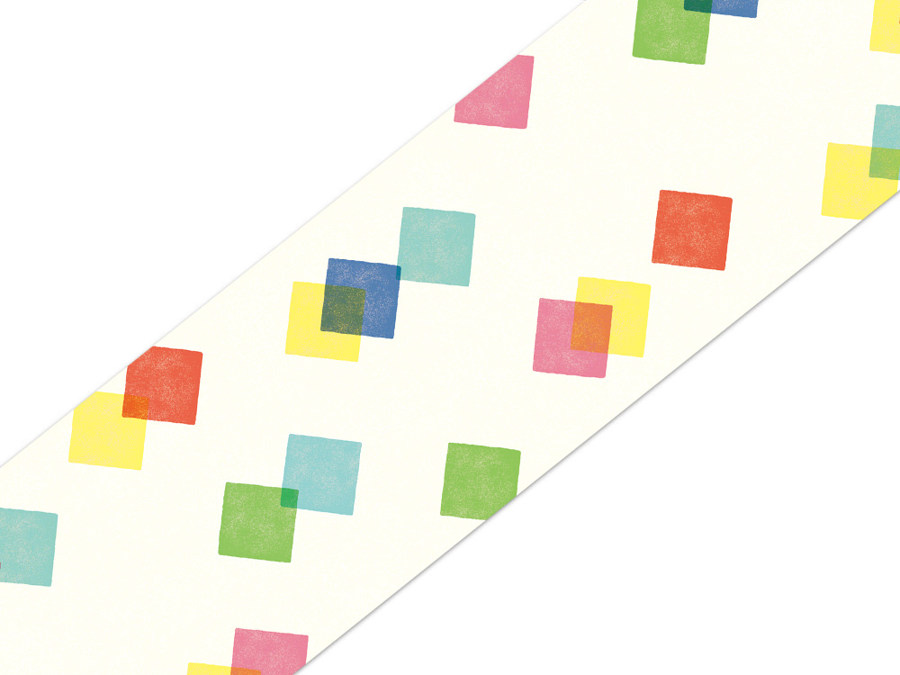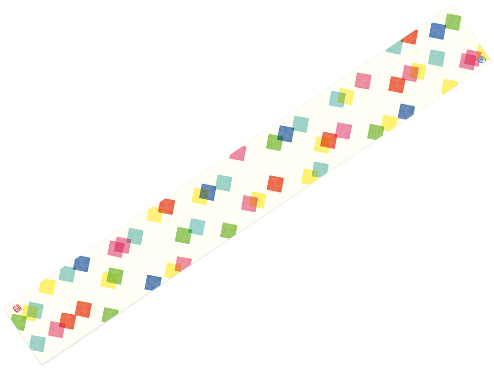 七夕飾りのひとつである「菱飾り」をイメージした、勝藤屋オリジナルの帯紙。淡いクリームの地色にポップな配色をちりばめた、元気で優しい雰囲気のあるデザインです。