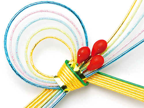 きらきらとした黄・ピンク・水色の水引を使って勢い良く結び、縁起のよい南天の実をアクセントに加えました。お重の装いに華やかで可愛らしい印象を添えます。