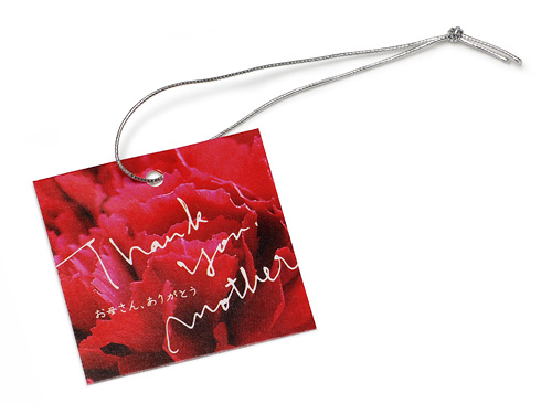 赤いカーネーションの写真に、英字で白く「Thank you mother」と書かれたタグです。シックな赤色にさりげないメッセージが洗練された雰囲気。4.5cm大の正方形で、ラッピングのポイントに最適です。