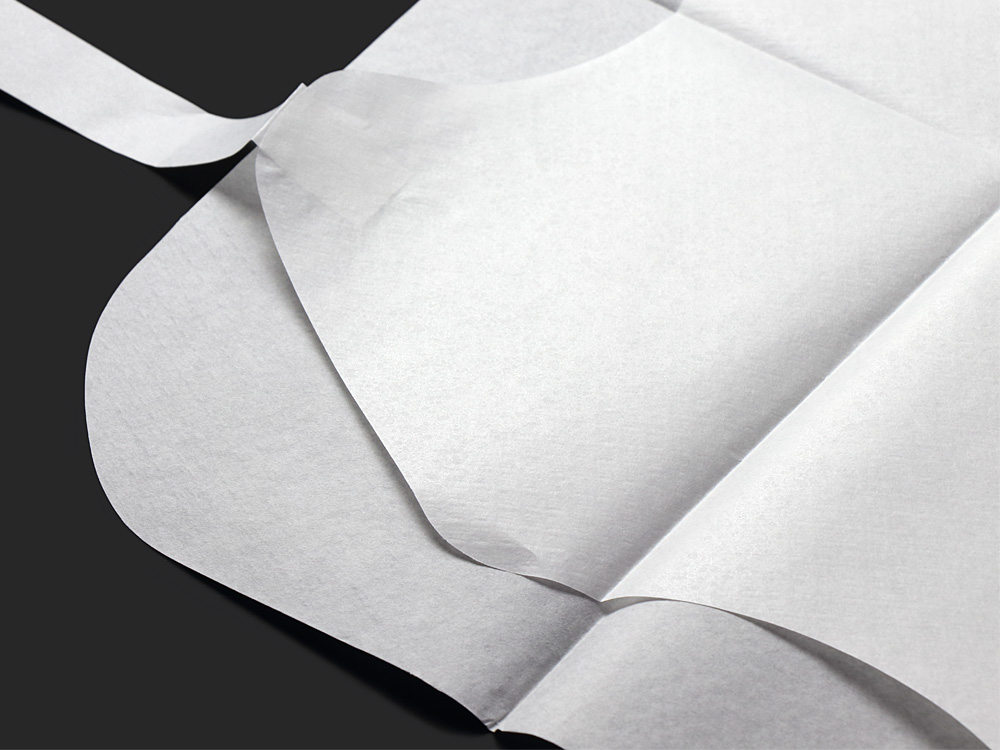 ソースの飛び散りや食べこぼしからお客様の衣服を守る、安価で使い勝手の良い紙エプロン。