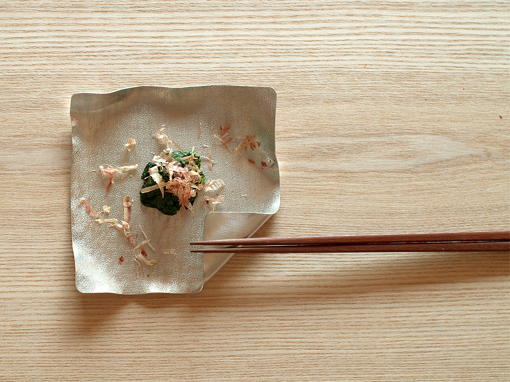 指先の軽い力で曲がる不思議な柔らかさで、スッと簡単に曲げられるのが特徴です。豆皿のように器として、小物を入れるトレーとして、筒型にしてオブジェとして、と使い方は自由自在。レジやカウンターに、ショップカード置きやメニュー立てとして使っていただくのも素敵です。どんな風に変形させて使うかを考えるのも楽しいですね。
