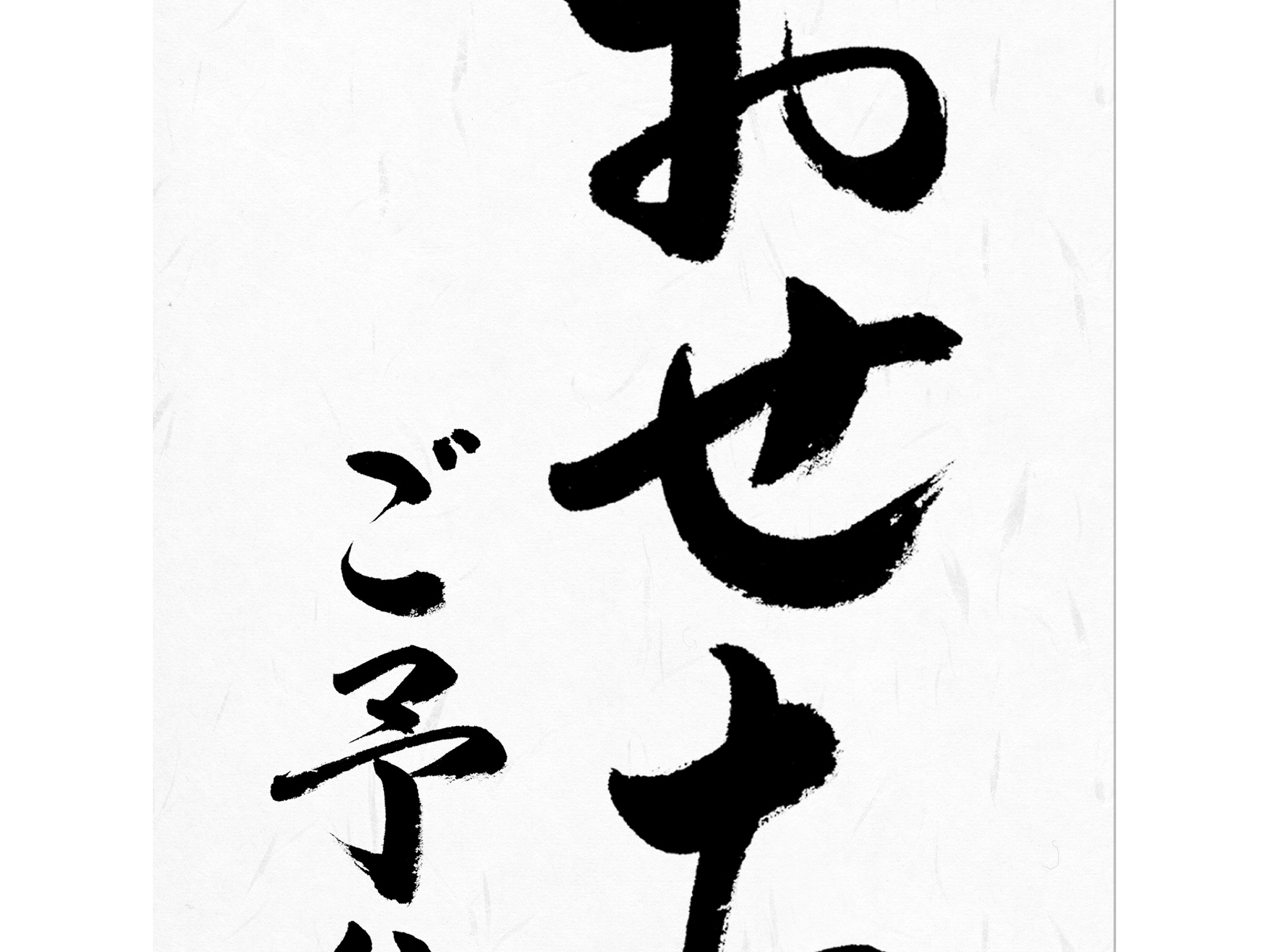 大礼の入った上品なホワイトの和紙に、味わいのある上品な筆文字で印刷をほどこしました。こちらはウインドウや店内に貼りやすい、細長いサイズです。