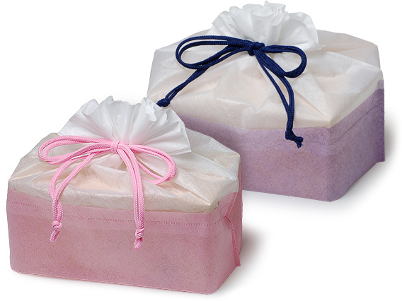 M、Lの2サイズ、2色展開で、折箱の大きさや用途に合わせてお選びいただけます。折箱を袋に入れ、口紐を結ぶだけの簡単包装。シンプルですが華やかな色使いはお花見弁当などにうってつけです。