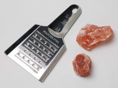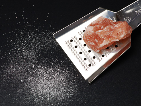 岩塩専用のおろし金。目立てを適度に低くしてあるので、岩塩が引っかからず、細かくパウダー状に引けます。また、おろし面に穴が開いているので、おろした岩塩を直接食材に振りかけることもできます。